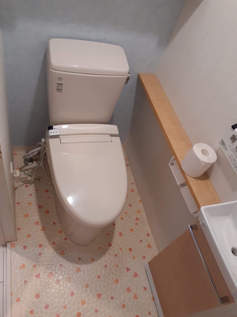 トイレBefore:ポップな柄のクッションフロアが目立っていました。