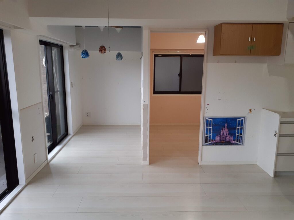 リビングBefore:全体的に白っぽい内装ですが、吊り戸棚の茶色が浮いて見えていました。経年劣化も気になっていました。