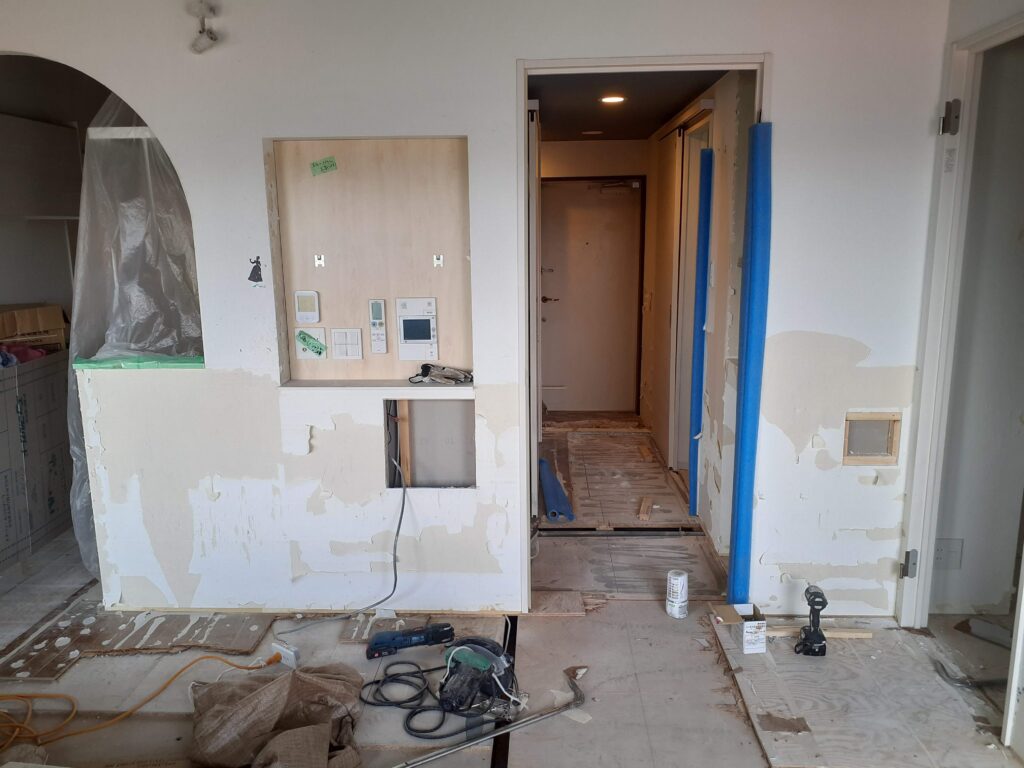 リビングから玄関施工中:壁、床を丁寧に下地処理しています。