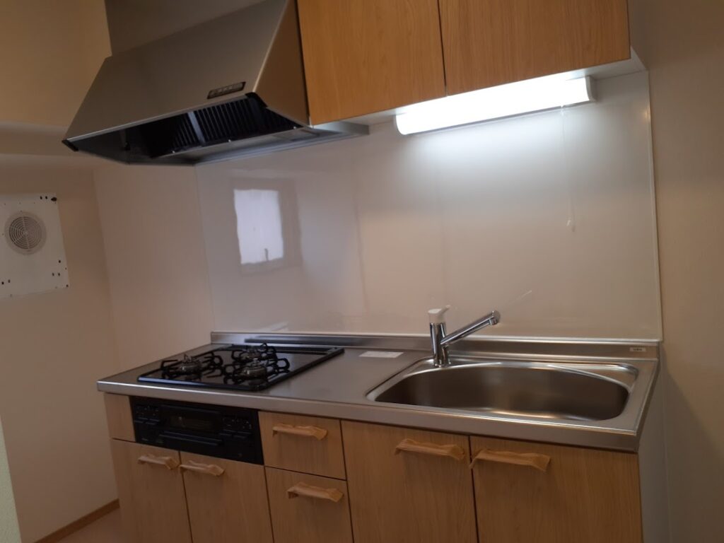 キッチン上部に吊り戸棚をつけて収納スペースもたっぷりです。照明で手元も明るく、お料理も快適にできそうです。